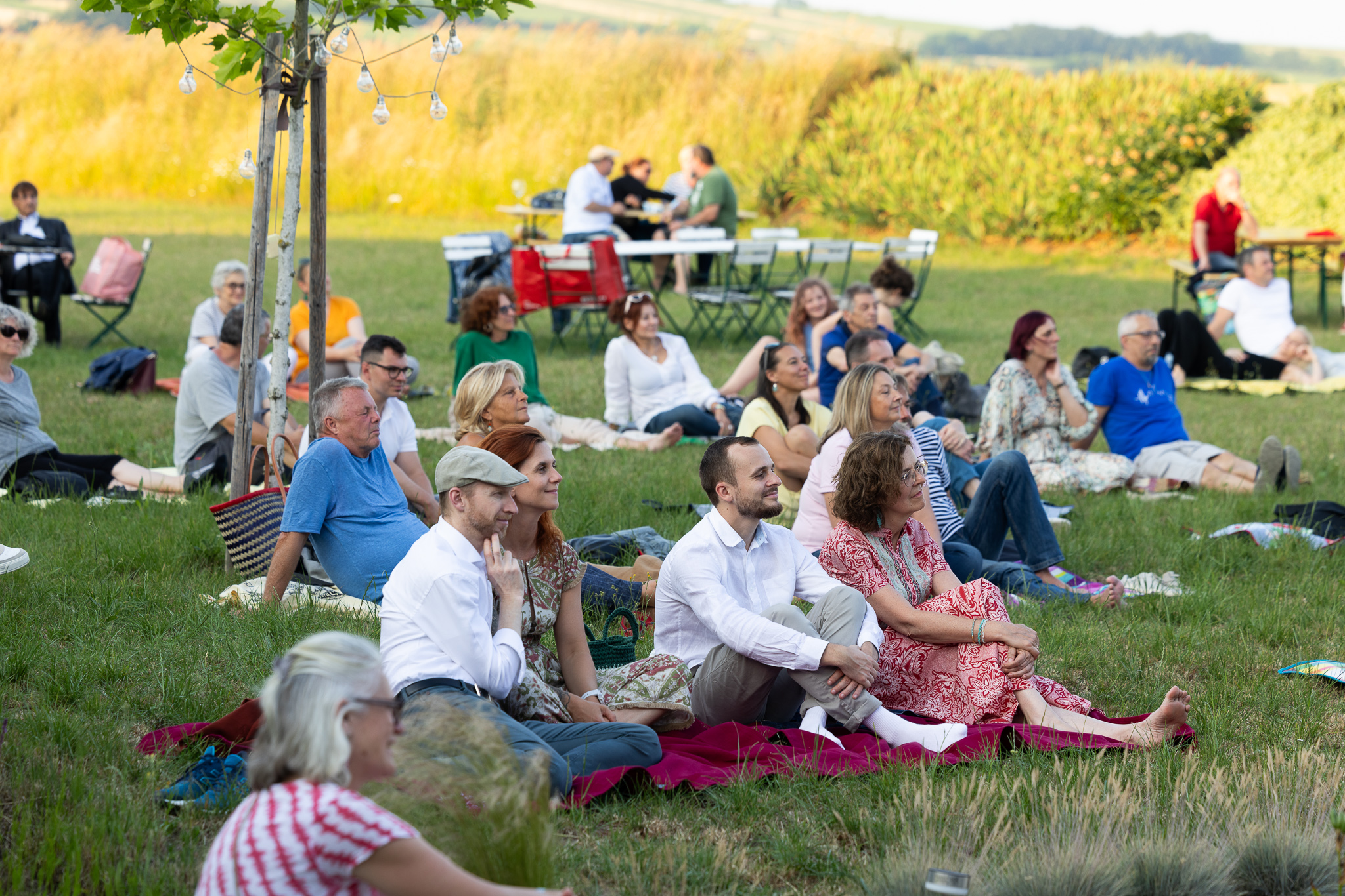 Die Gäste sitzen oder liegen in der Wiese, genießen die Musik, spüren den Wind auf der Haut und genießen die Besonderheit des Ortes mit allen Sinnen.
