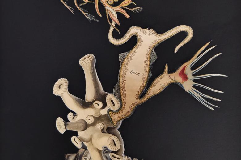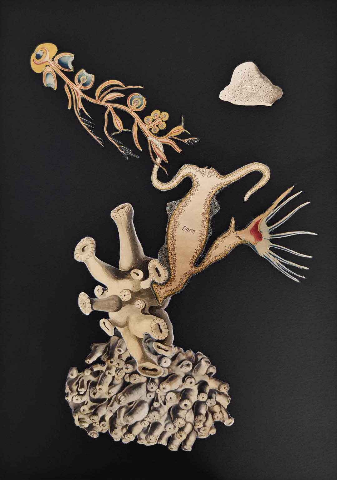 Lena Rosa Händle verweist mit ihren Collagen auf Symbiosen in Natur und Gesellschaft. Pilze, Flechten, Algen und Mikroorganismen zeigen, dass Leben nicht auf Konkurrenz, sondern auf gegenseitiger Hilfe basiert. Diese Netze der Verbundenheit dienen ihr als poetische Vorbilder für eine solidarische Zukunft.