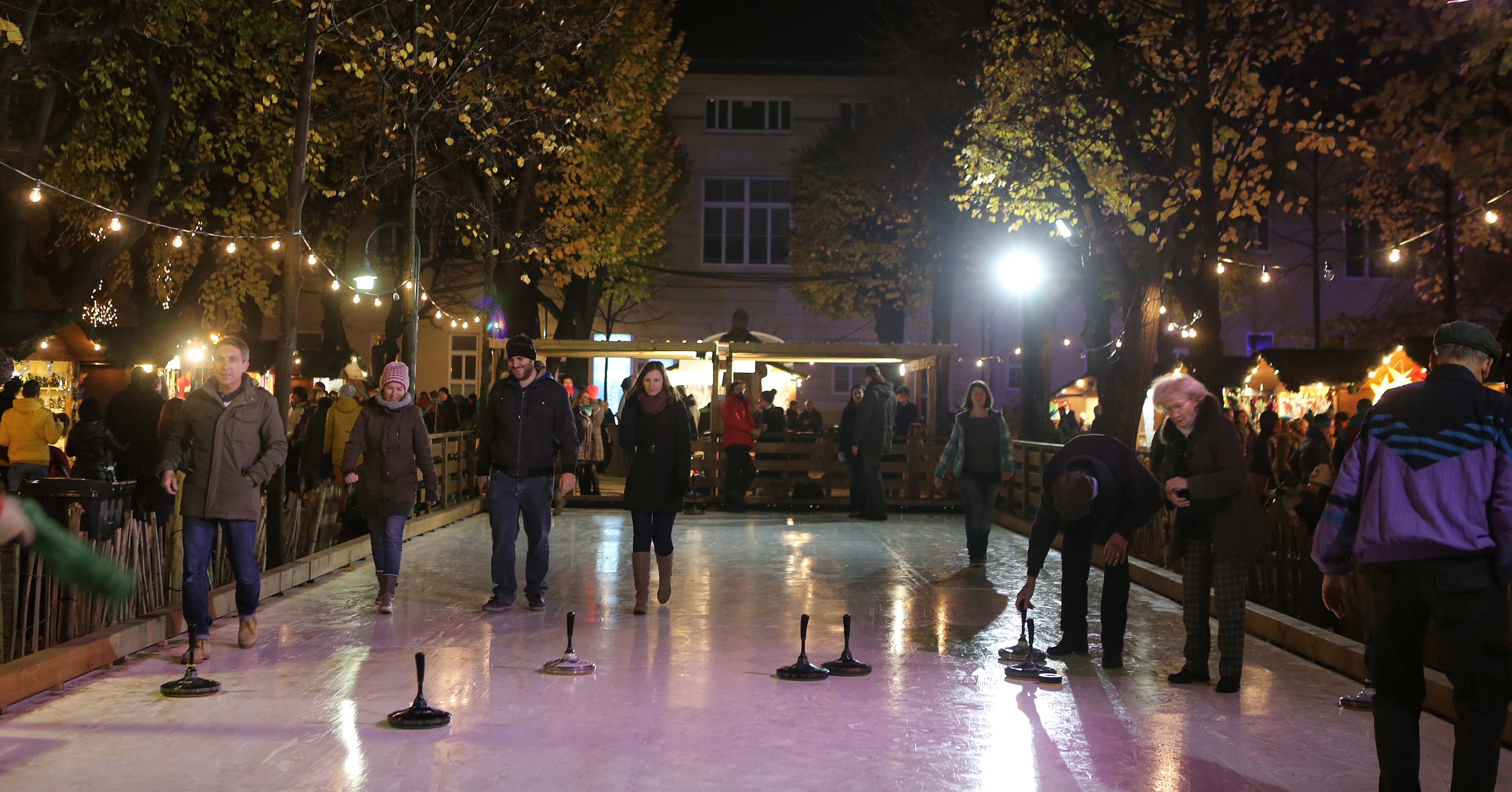 Auf vier Bahnen können Besucher in Gruppen oder mit Freunden das traditionelle Eisstockschießen unter Anleitung erfahrener Betreuer:innen erlernen – oder sich im sportlichen Wettkampf messen. Weitere Details und Reservierungen auf weihnachtsdorf.at.