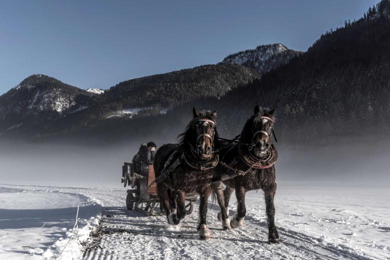 Mit Decken eingehüllt durch verschneite Wälder gleiten – in Gosau wird die Pferdeschlittenfahrt zum Wintermärchen. Vor der beeindruckenden Kulisse des Dachsteins spürt man hier die stille Magie des Winters hautnah.