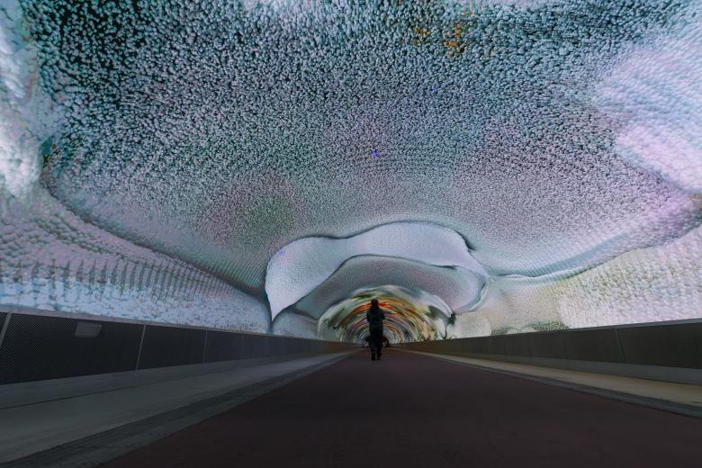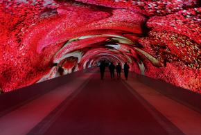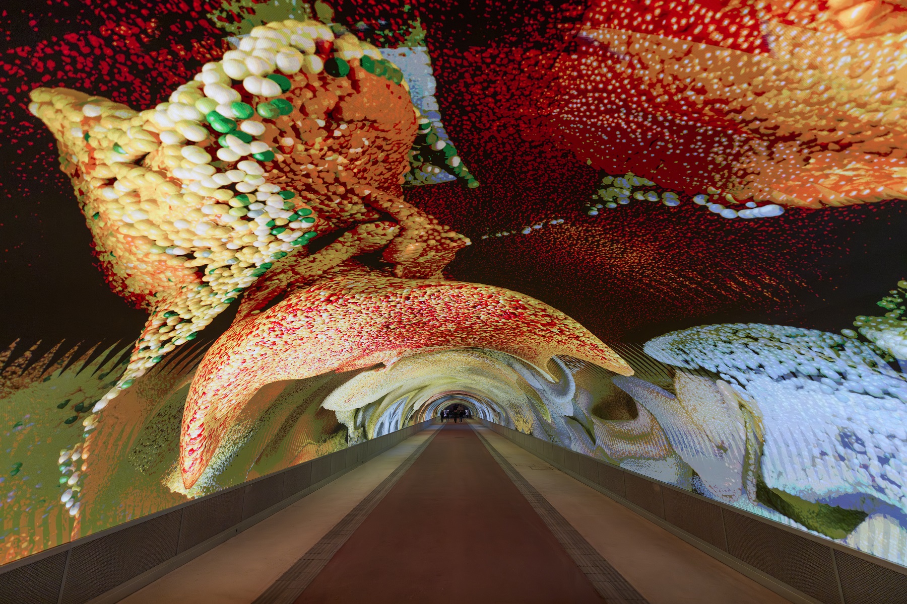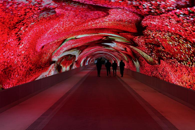 Ein mehr als 300 Meter langer Ausstellungsweg, von denen 100 vollständig mit hochmodernen LEDs verkleidet und so in eine visuelle Umgebung umgewandelt wurden. Das Ergebnis ist ein immersives Erlebnis, das sich über 1.000 Quadratmeter digitale Fläche erstreckt und Kunst und Technologie miteinander verschmelzen lässt.