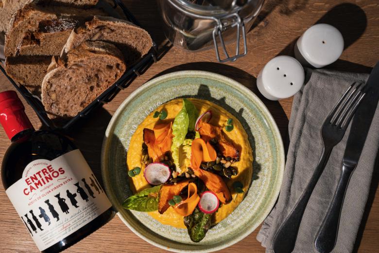 Kürbis-Hummus mit Olivenöl Entre Caminos Aceite bio