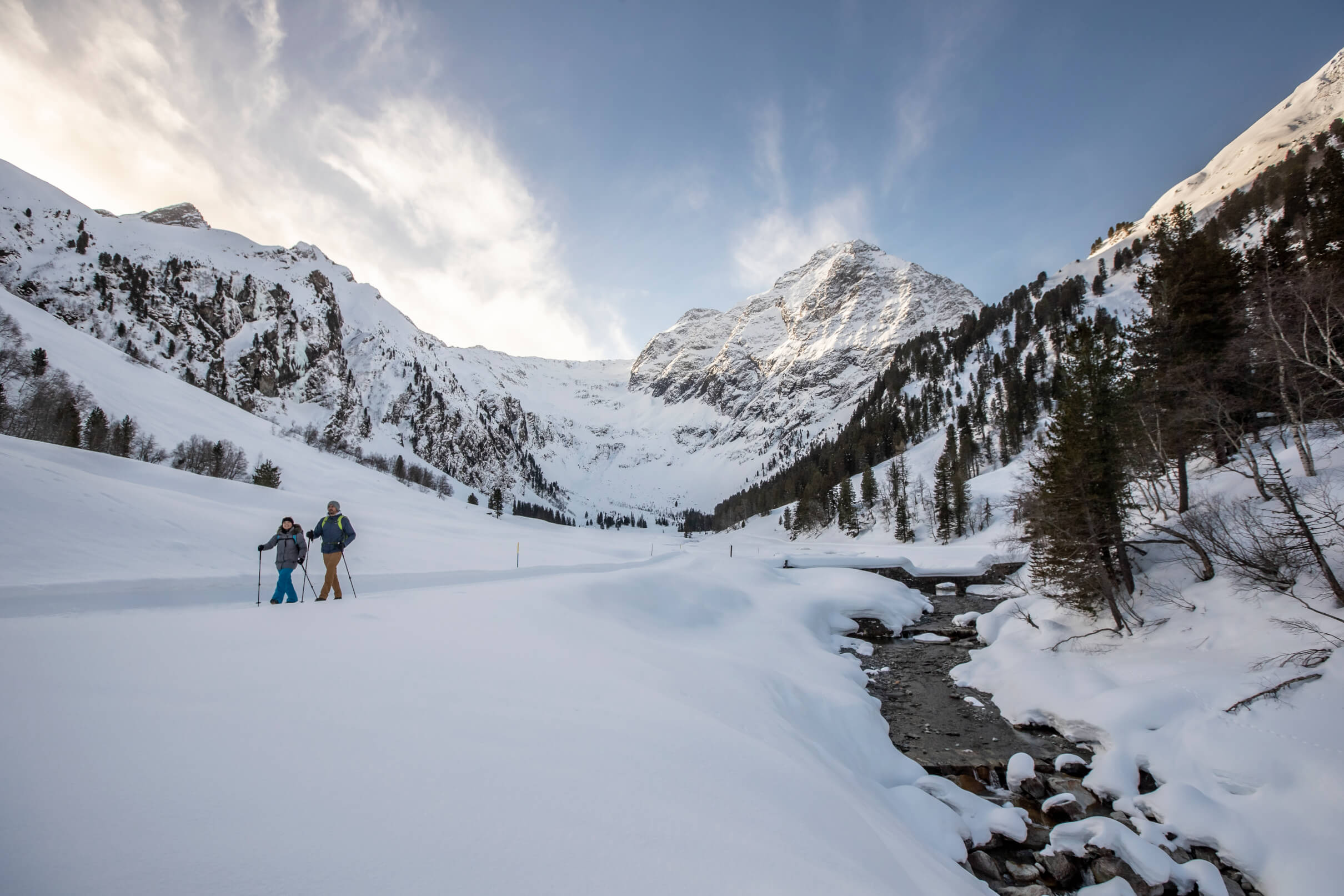 Schneeschuhwandern im Sellraintal: Wenn frische Flocken das Sellraintal in eine idyllische Winterlandschaft verwandeln, sorgt eine ausgedehnte Schneeschuhwanderung für Entschleunigung und Ausgeglichenheit. Das Tal bietet Touren für jeden Geschmack – ob gemütlich durch verschneite Wälder oder hinauf auf aussichtsreiche Höhen. Mit jedem Schritt durch den knirschenden Schnee, vorbei an verschneiten Fichten und mit Blick auf majestätische Gipfel, rückt der Alltag ein Stück weiter in die Ferne. Und in einer der urigen Almhütten warten hausgemachte Köstlichkeiten als verdiente Belohnung.